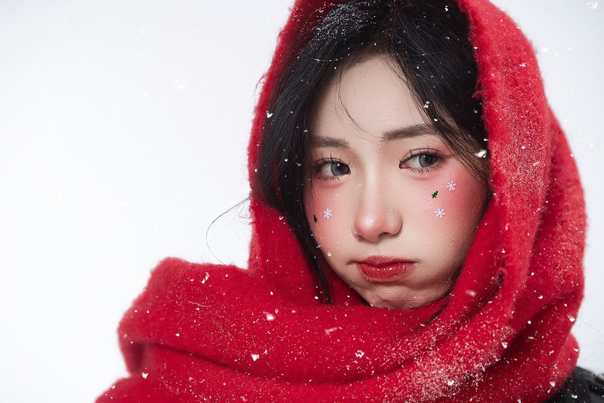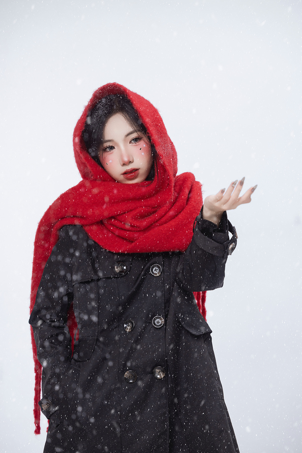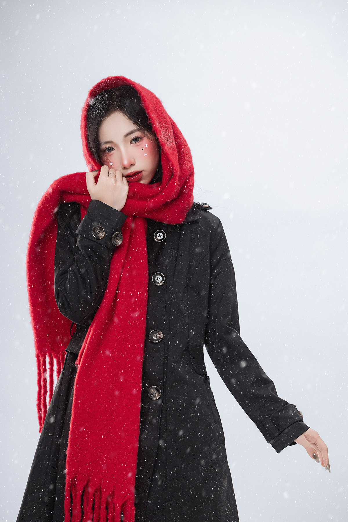 Khăn đỏ, biểu tượng cho sự ấm áp và niềm vui, kết hợp hoàn hảo với họa tiết bông tuyết, nhấn mạnh tinh thần đoàn viên và khát khao chúc mừng mùa lễ hội. Những khoảnh khắc an lành và ấm áp trong bộ ảnh khiến người xem cảm nhận rõ rệt về sự gần gũi và tình cảm gia đình trong dịp lễ đặc biệt này.