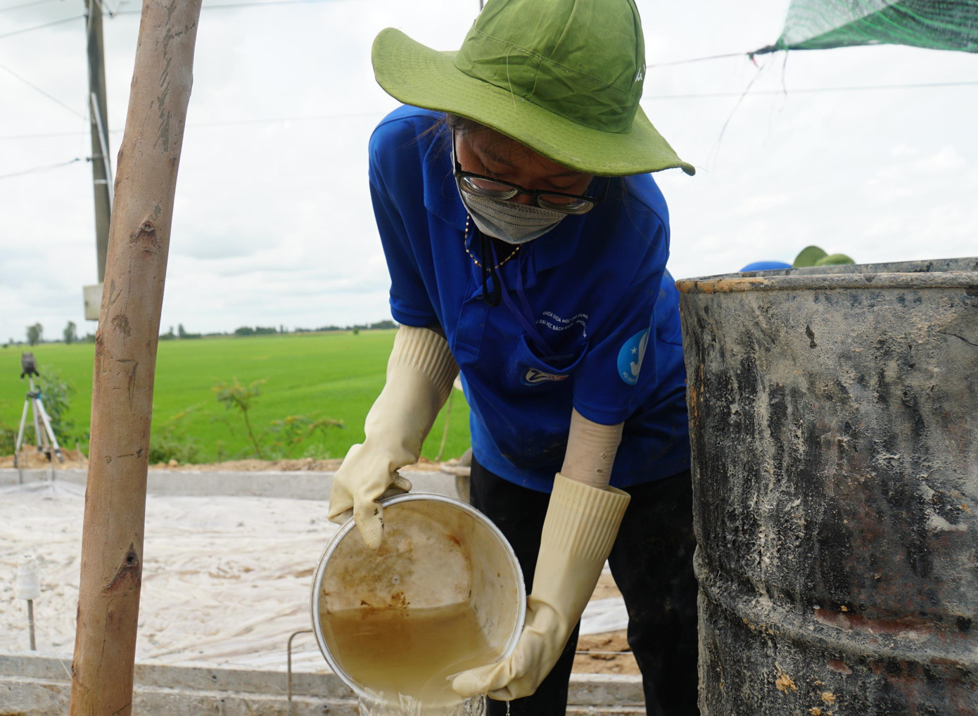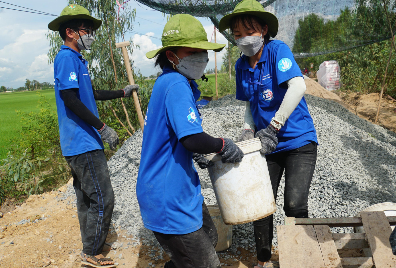 | Bạn Nguyễn Hương Nhi, sinh viên năm 2, ngành Vật lý kỹ thuật cho biết, do không quen với công việc nặng nên có nhiều bạn bị trầy xước tay chân, xi măng văng vào mắt, thậm chí có bạn đạp đinh phải chở đến trạm y tế tiêm ngừa. “Tuy vất vả nhưng cố gắng hoàn thành công trình để giúp người dân, đặc biệt là các em học sinh có con đường khang trang. Hơn nữa, thấy tụi em làm việc mệt nên các cô chú trong ấp có cây, trái gì cũng cho tụi em”, Nhi chia sẻ. - Ảnh: Hòa Hội |