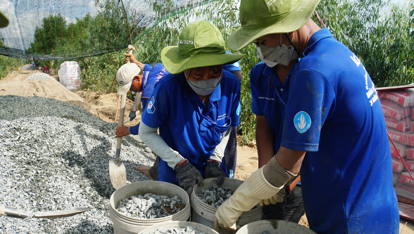 | Mỗi người mỗi việc, từ khuân cát, đá, xi măng, đứng cối, các bạn phối hợp với nhau một cách nhịp nhàng. Tiếng nói cười vui vẻ, nhộn nhịp giữa nắng gắt và cánh đồng không bóng người đã xua đi bao mệt mỏi, vất vả. - Ảnh: Hòa Hội |