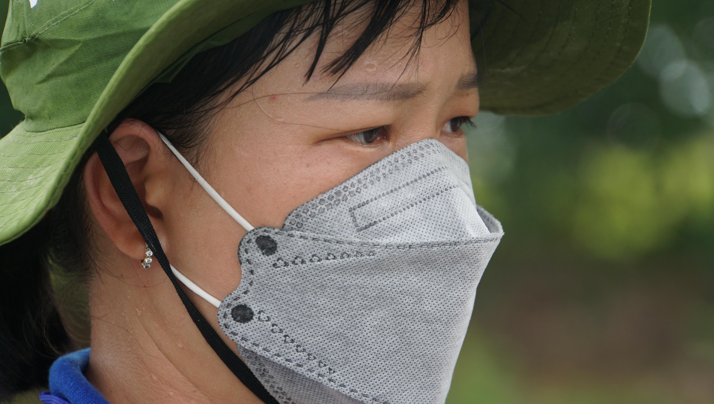 | Nữ chiến sĩ hỗ trợ đồng đội đeo khẩu trang. - Ảnh: Hòa Hội |