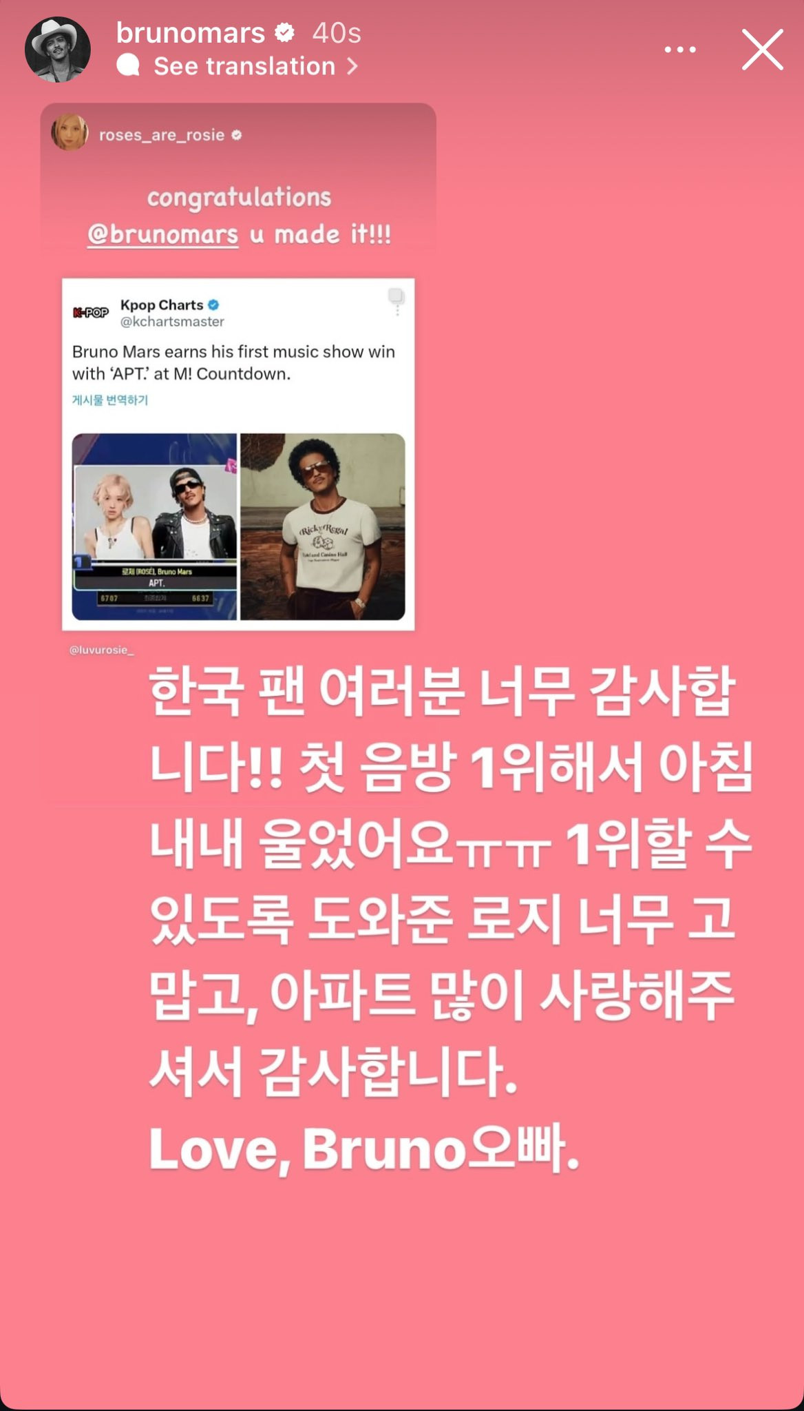 "Người hâm mộ Hàn Quốc, cảm ơn các bạn rất nhiều! Tôi đã khóc suốt buổi sáng sau khi giành chiến thắng trong chương trình âm nhạc đầu tiên. Cảm ơn Rosie đã giúp anh lấy hạng 1 nhé, cảm ơn vì tất cả tình yêu và sự ủng hộ mà mọi người đã dành cho APT.