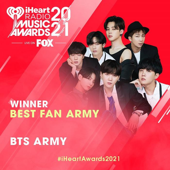 Tại iHeartRadio Awards năm nay, 7 anh chàng BTS được đề cử ở 4 hạng mục, bao gồm: Best Duo/Group, Best Music Video, Best Music Video Choreography và Best Fan Army. Kết quả là BTS đã mang về nhà 3/4 chiến thắng.