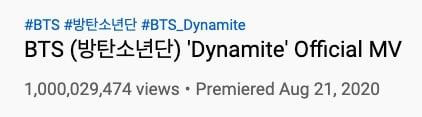 "Ra sân" vào ngày 21/8/2020, sau khoảng 234 ngày (tương đương 7 tháng, 22 ngày và 4 giờ) trên sàn đấu YouTube, MV Dynamite của BTS đã chính thức vượt 1 tỉ lượt xem vào khoảng 17 giờ 46 phút ngày 12/4/2021 (theo giờ Hàn Quốc).