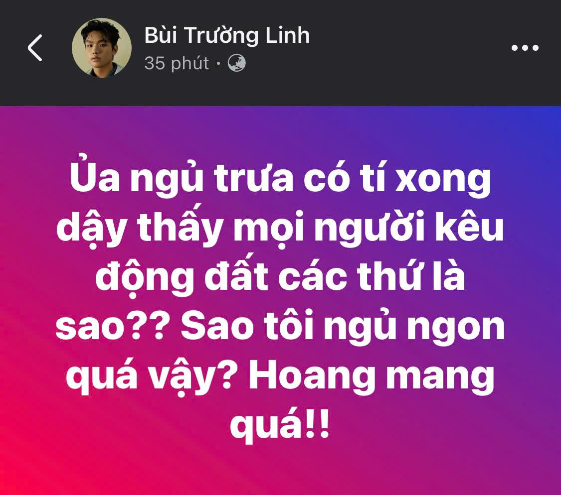 ERIK, LyLy, Bùi Trường Linh,... cũng bị bất ngờ khi động đất xảy ra. Trong khi các nghệ sĩ khác lo lắng, sợ hãi "lắc lư như say sóng", đồ vật rung chuyển thì Bùi Trường Linh "ngủ trưa ngon quá" nên không cảm nhận được gì. Nam ca sĩ Hải Đăng Doo đang ở Thái Lan cũng phải "ôm gối" chạy vội xuống đường khi xuất hiện cơn rung chấn.