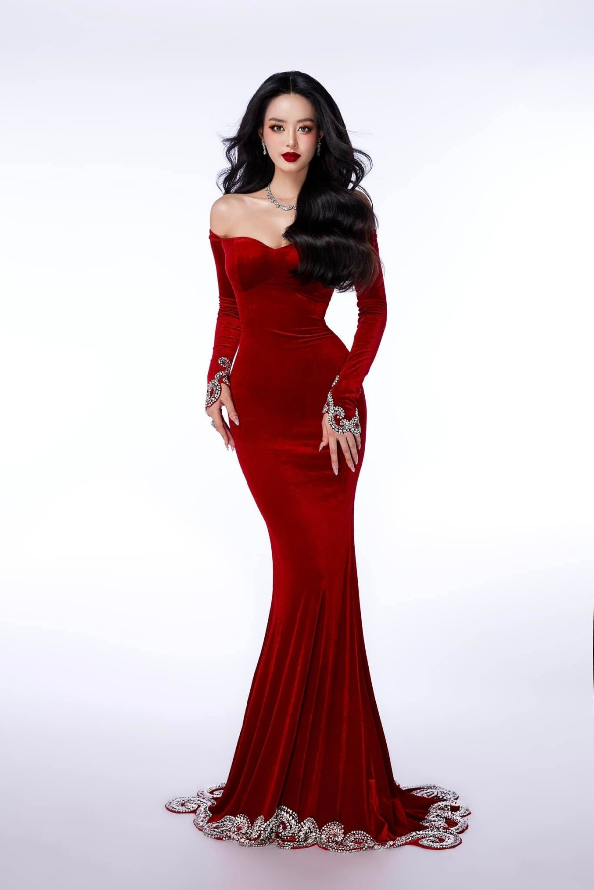 Trước đó trong bộ ảnh profile được chụp trước khi tới Miss Intercontinental 2024, Bùi Khánh Linh cũng đã diện một thiết kế màu đỏ ôm sát chất liệu nhung, nàng hậu đánh son đỏ nổi bật. Netizen hi vọng Khánh Linh cũng sẽ đánh lại màu son này trong đêm Chung kết.