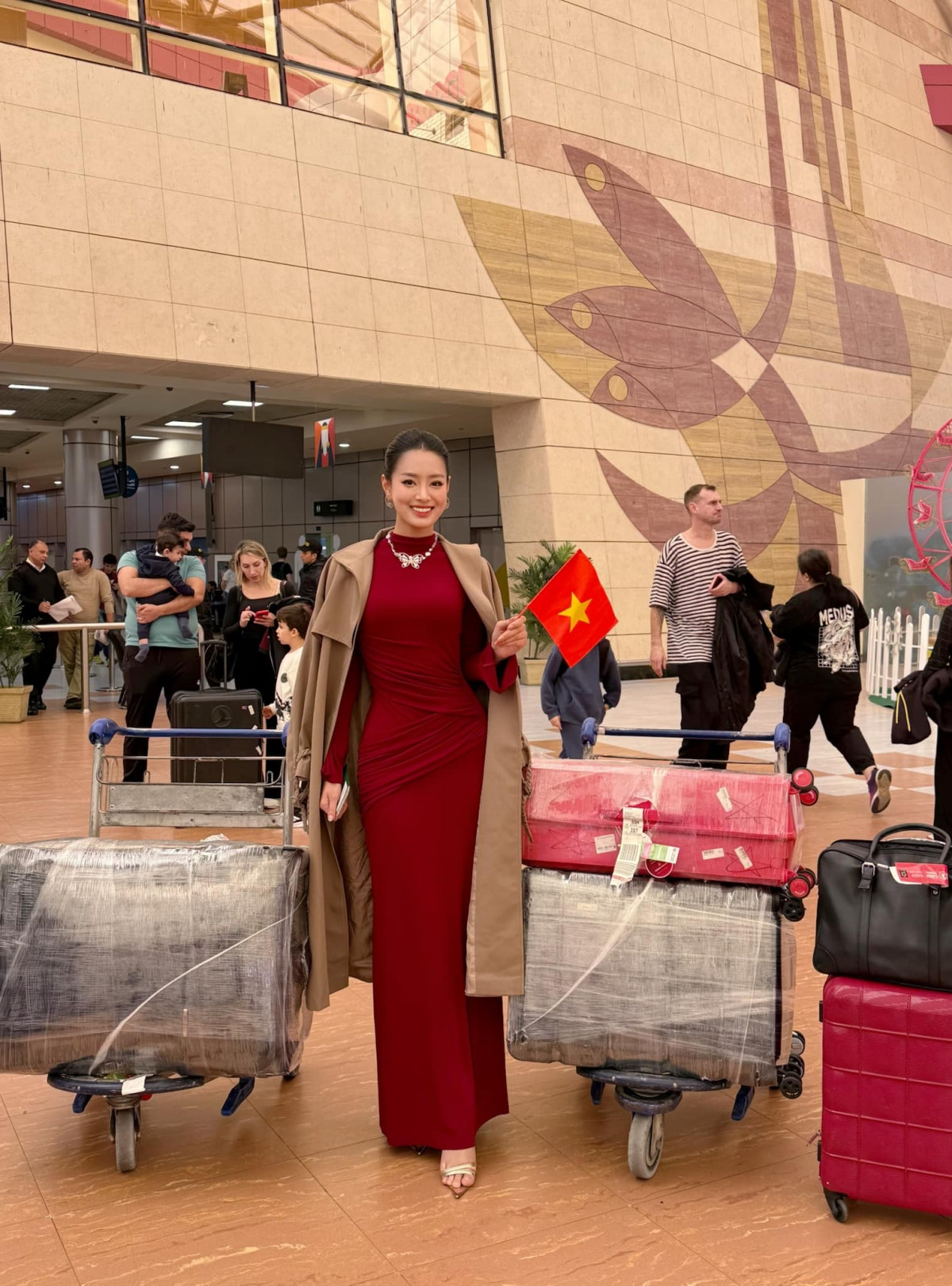 Á hậu Bùi Khánh Linh đã tới Ai Cập an toàn với đầy đủ hành lý. Người đẹp mặc thiết kế váy đỏ dài nổi bật, tóc búi cao, khoe vòng eo siêu nhỏ.