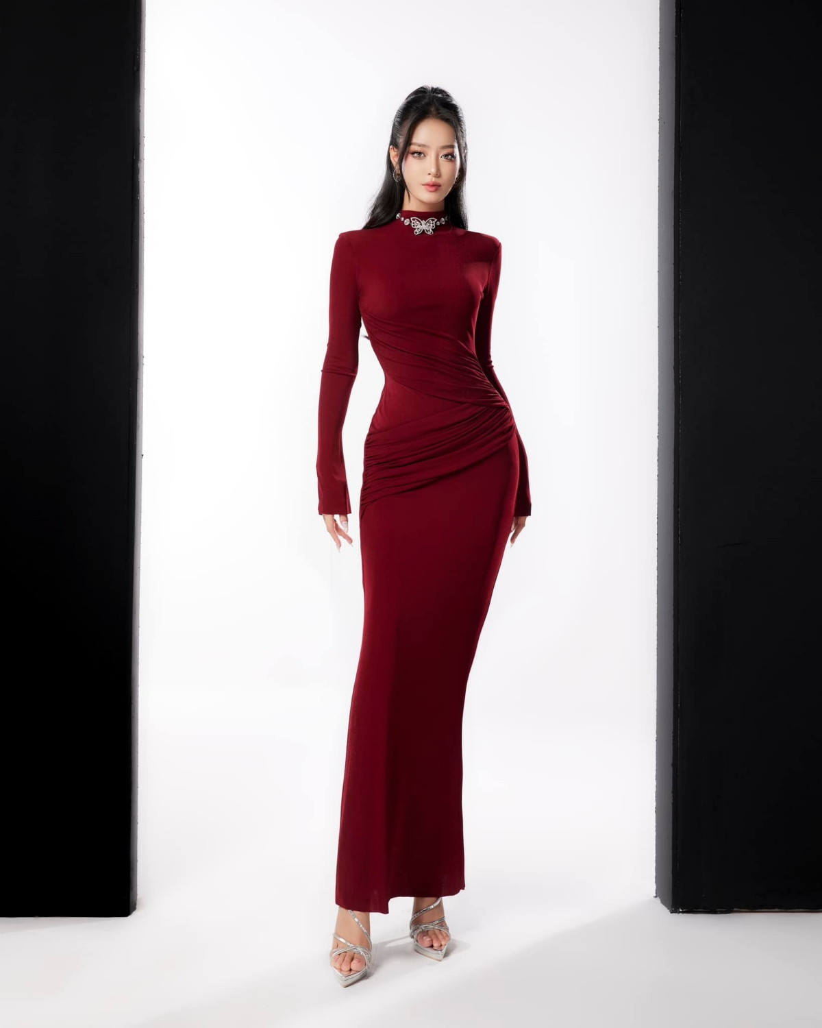 Tại hoạt động đầu tiên với các thí sinh, Khánh Linh tiếp tục chọn một thiết kế váy dài đơn sắc.