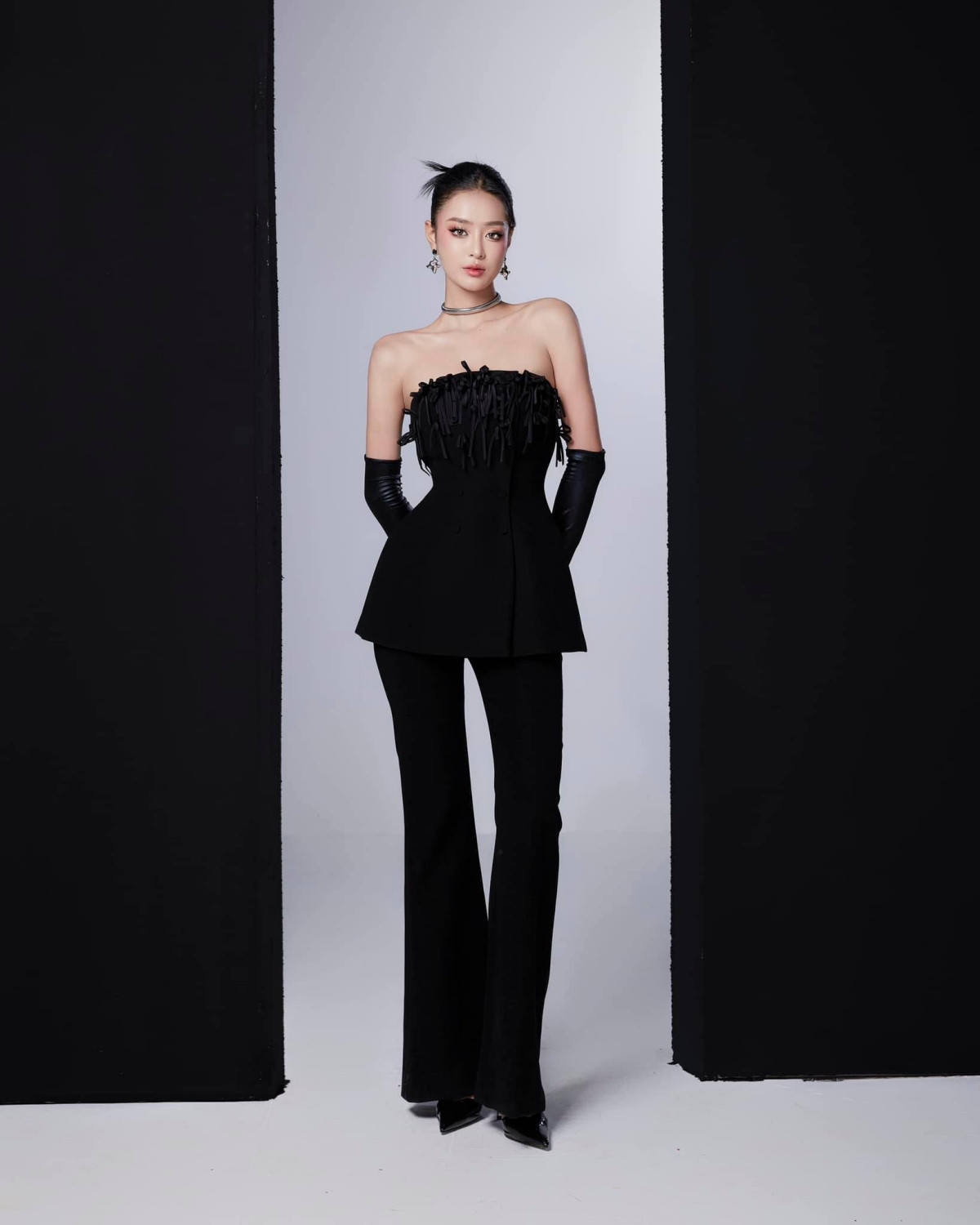 Thiết kế tiếp theo được Khánh Linh lựa chọn là một set đồ màu đen sang trọng, tiếp tục giúp người đẹp khoe trọn sắc vóc nổi trội bên cạnh dàn thí sinh.