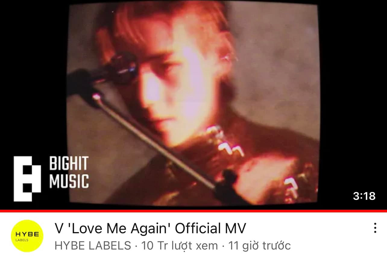 Bất chấp màn "trả bài" nhanh như chớp của V khi 8 giờ sáng vừa công bố lịch trình, đến 22 giờ đêm cùng ngày liền "thả xích" MV (theo giờ Việt Nam), Love Me Again vẫn đang cho thấy sức hút khi mang về con số khả quan với 10 triệu lượt xem sau hơn 11 giờ phát hành trên YouTube.