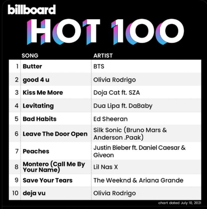 Ngay sau đó ít phút, Billboard cũng công bố Top 10 Billboard Hot 100 tuần này, theo đó Butter của BTS tiếp tục trụ vững vị trí No.1 tuần thứ 6 liên tiếp, mang đến cho BTS kỷ lục là nhóm nhạc đầu tiên trong lịch sử BXH Billboard Hot 100 có ca khúc debut ở vị trí No.1 và giữ nguyên ngôi vương trong 6 tuần.