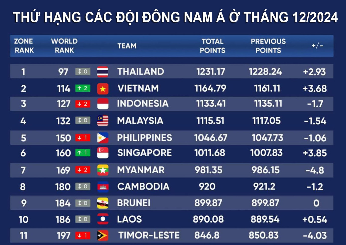 Trong tháng 12, phần lớn các đội tuyển trên thế giới không thi đấu nên bảng xếp hạng FIFA không chứng kiến nhiều xáo trộn. Trong bối cảnh đó, khu vực biến động nhất là Đông Nam Á khi nơi đây diễn ra giải ASEAN Cup 2024.