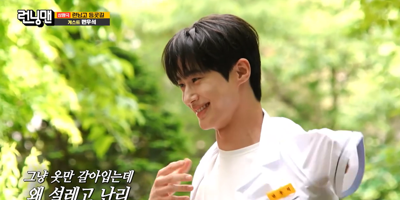 Vì Byeon Woo Seok tham gia như một cách quảng bá cho Lovely Runner, nên concept của tập Running Man này cũng là học đường. Woo Seok xuất hiện trong đồng phục học sinh, anh bị chặn lại "câu giờ" bởi người mẹ (giả tưởng).
