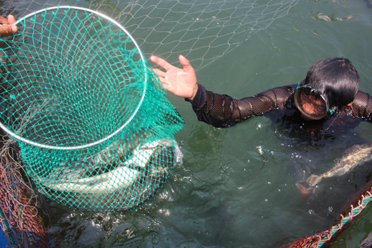 Anh Huỳnh Phổ, 53 tuổi (thôn Hải Ninh, Bình Thạnh), kể: Gia đình anh thả 2.500 con cá bớp giống từ sau Tết Nguyên đán. Cá đạt trung bình 2,5 kg/con, sắp đến ngày xuất bán thì chết tới 50%, phải bán tháo với giá 50-60 ngàn đồng/kg, thấp hơn 2-4 lần so với giá bình thường”.