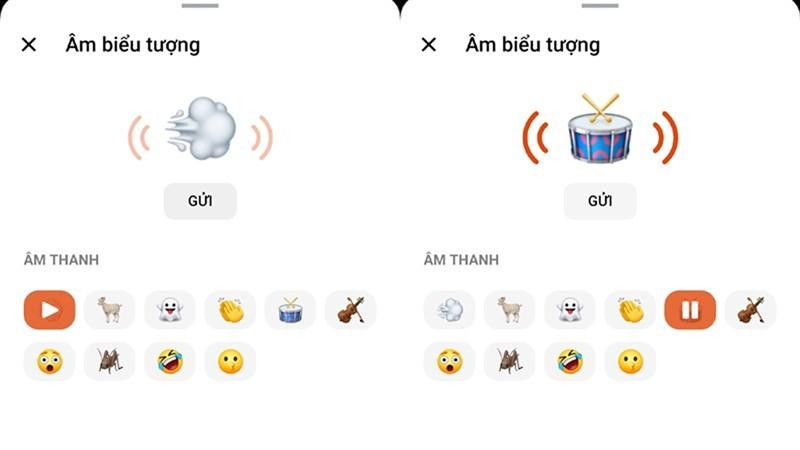 Bước 3: Chọn tiếp vào biểu tượng loa thì bạn sẽ thấy một số biểu tượng có thể phát ra âm thanh đó, bạn có thể chọn vào ngay biểu tượng đó để nghe âm thanh nó phát rồi bấm Gửi để gửi, hoặc kéo dấu gạch ngang lên để có thêm nhiều biểu tượng nữa.