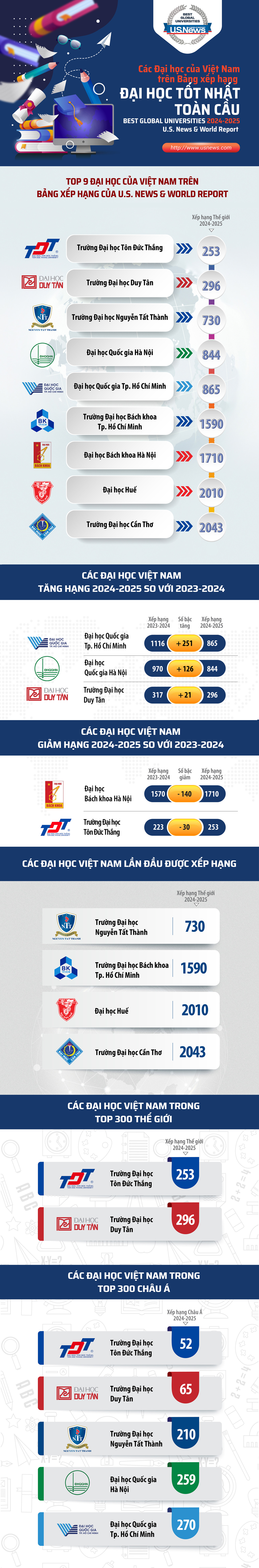 Tổ chức U.S.News & World Report (Mỹ) cuối tháng 6 đã công bố bảng xếp hạng Đại học tốt nhất toàn cầu năm 2024-2025. Trong số 2.250 cơ sở giáo dục đại học từ 104 quốc gia, vùng lãnh thổ được xếp hạng, Việt Nam có 9 trường được xếp hạng ở bảng này.