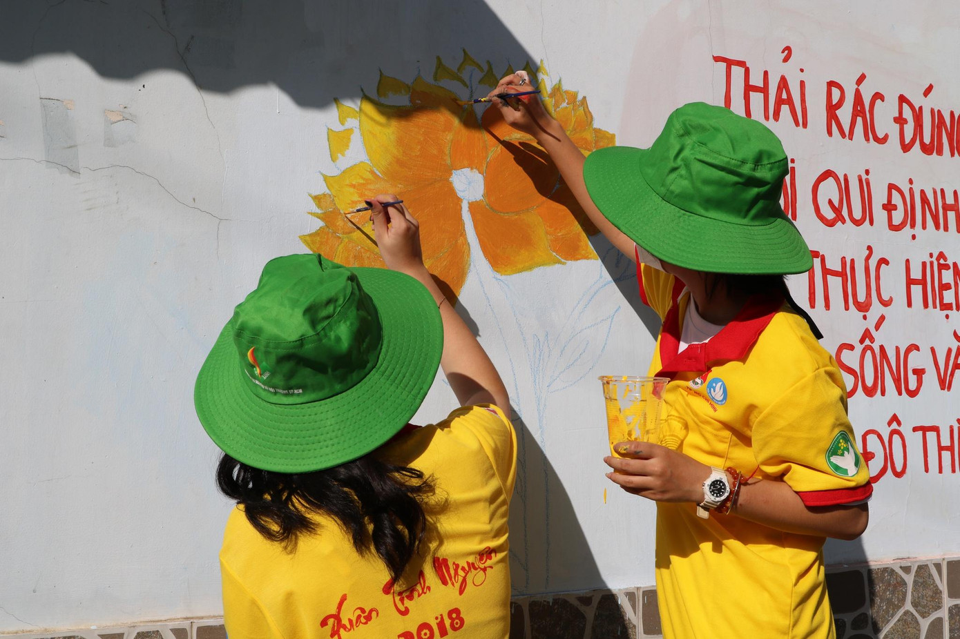 | Đoàn viên thanh niên tham gia vẽ tranh tuyên truyền về chủ đề bảo vệ môi trường, an toàn giao thông, phòng chống dịch COVID-19 sau lễ phát động. |