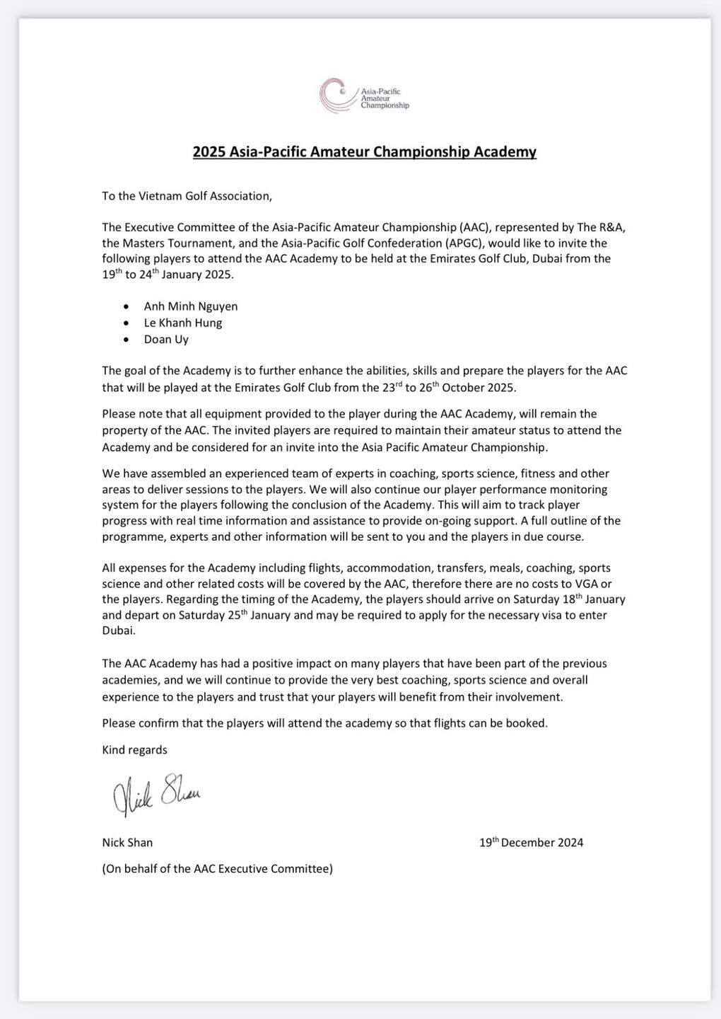 Khoá tập huấn cho giải vô địch nghiệp dư châu Á-Thái Bình Dương 2025 (AAC) được tổ chức tại sân Emirates Golf Club, Dubai từ ngày 19 - 24/1/2025. Trong suốt một tuần, các vận động viên sẽ tham gia các buổi huấn luyện chuyên sâu về kỹ thuật, thể lực và chiến thuật do các huấn luyện viên danh tiếng của AAC đứng lớp.