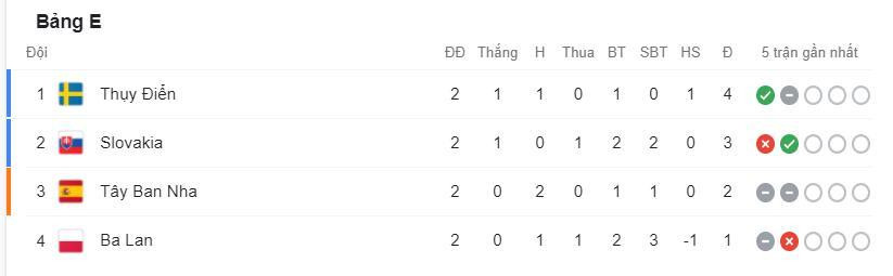 Bảng E: Slovakia (3 điểm) vs Tây Ban Nha (2), Thụy Điển (4, đi tiếp) vs Ba Lan (1) - điểm số trước loạt trận cuối cùng.