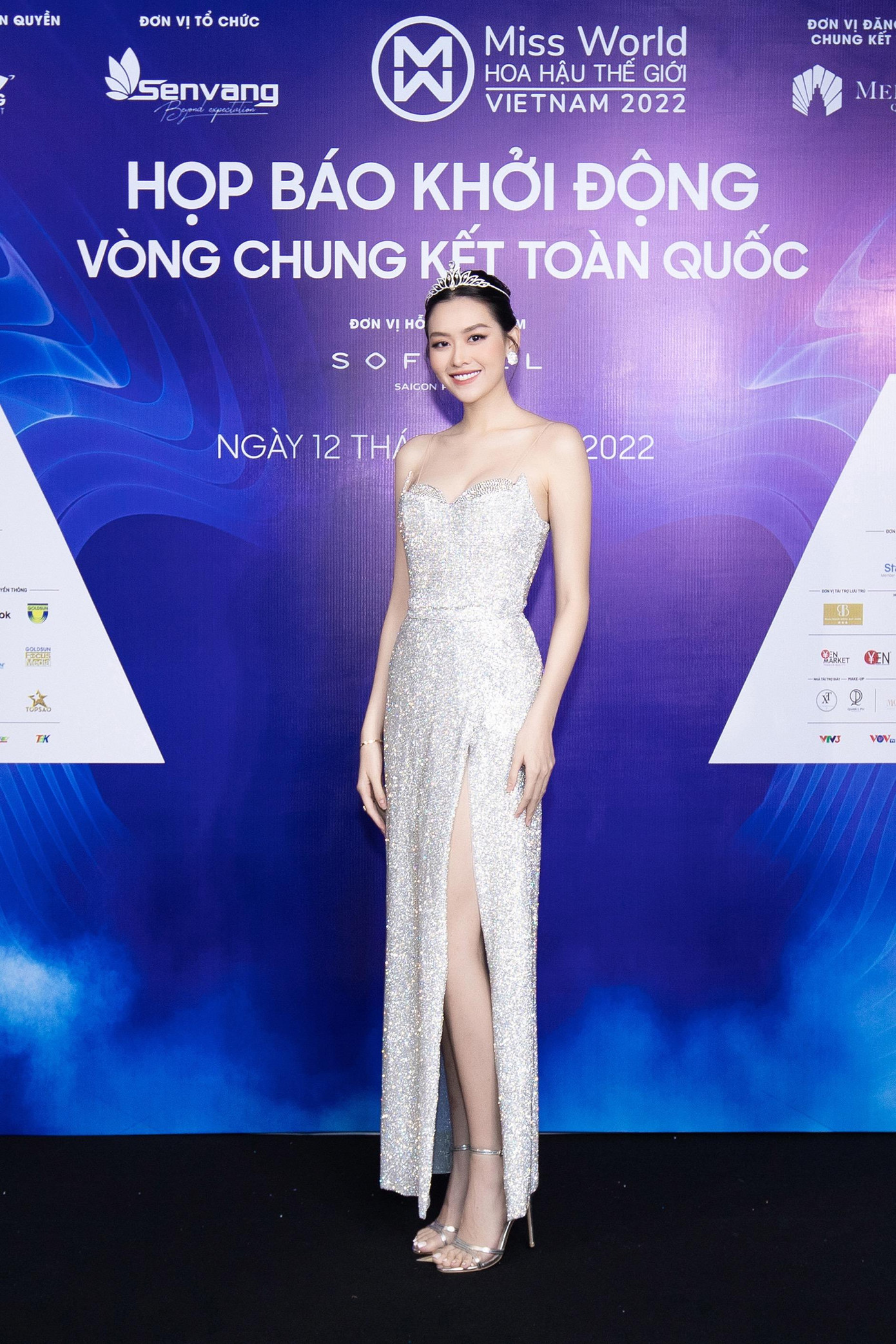Cũng chọn cho mình chiếc đầm dạ hội vô cùng lấp lánh đã khiến nàng Á hậu Tường San tựa 'nữ thần' trên thảm đỏ Họp báo.