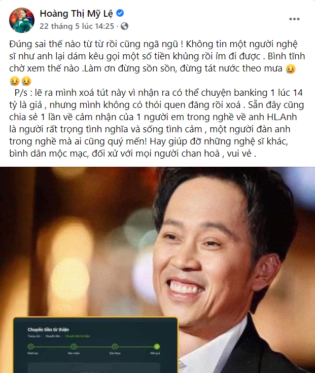 Cô chia sẻ thêm sau khi nhận lại những tranh cãi: “Lẽ ra mình xoá status này vì nhận ra có thể chuyện banking một lúc 14 tỷ là giả, nhưng mình không có thói quen đăng rồi xoá. Sẵn đây cũng chia sẻ một lần về cảm nhận của một người em trong nghề về anh Hoài Linh. Anh là người rất trọng tình nghĩa và sống tình cảm, một người đàn anh trong nghề mà ai cũng quý mến! Hay giúp đỡ những nghệ sĩ khác, bình dân mộc mạc, đối xử với mọi người chan hoà, vui vẻ".