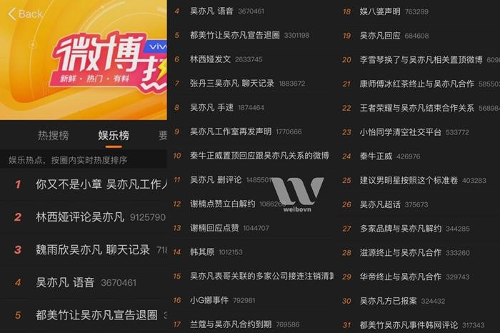 Sáng ngày 19/7, Ngô Diệc Phàm đã tạo nên kỷ lục mới bất đắc dĩ khi thống trị toàn bộ Top 30 hot search của Weibo, một điều chưa từng xảy ra với mạng xã hội này, đủ để thấy scandal lần này của Ngô Diệc Phàm tệ hại đến mức nào.