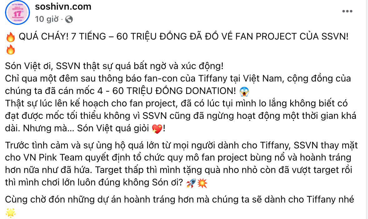 Phía FC SoshiVN chia sẻ: “Thật sự lúc lên kế hoạch cho fan project, đã có lúc tụi mình lo lắng không biết có đạt được mốc tối thiểu không vì SSVN cũng đã ngừng hoạt động một thời gian khá dài. Nhưng mà… Són Việt quá giỏi.”