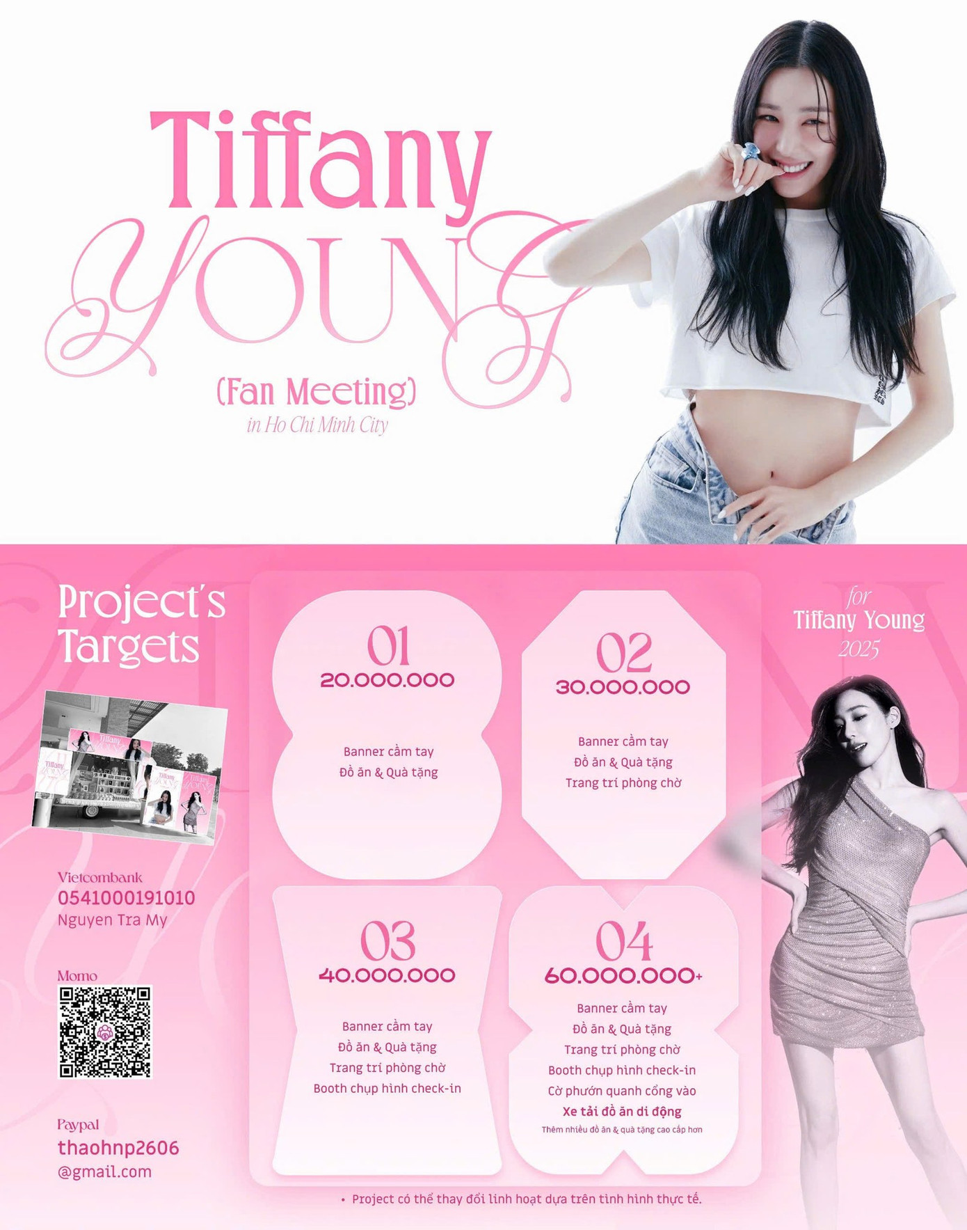 Với con số này, ở giai đoạn 1, SoshiVN sẽ đứng ra chuẩn bị các hạng mục “tiếp ứng” gồm: Banner cầm tay cho các V-Sone, trang trí phòng chờ thật bling bling, có khu vực booth check-in dành riêng cho fan, xe tải đồ ăn dành cho Tiffany và đội ngũ staff, cờ phướn trang trí, quà tặng cho Tiffany.
