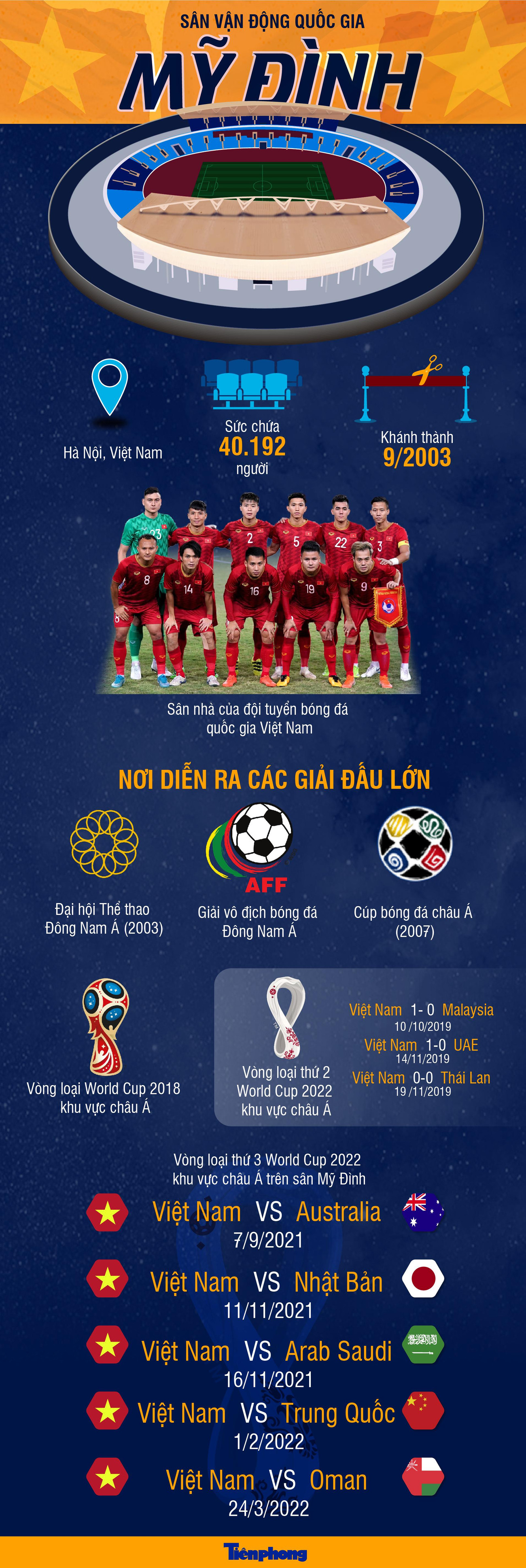 TPO - Việt Nam sẽ đăng cai 5 lượt trận trên sân nhà của đội tuyển bóng đá Nam tại vòng loại thứ 3 World Cup 2022. Sân vận động Quốc gia Mỹ Đình - nơi diễn ra các trận đấu - là một sân vận động đa năng ở Hà Nội, có sức chứa 40.192 chỗ ngồi và là trung tâm liên hợp thể thao quốc gia Việt Nam.