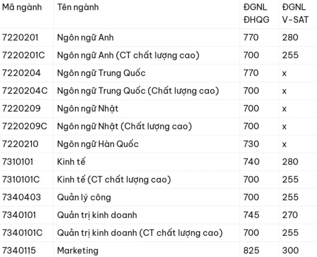 | Điểm chuẩn trúng tuyển đối với phương thức xét tuyển dựa vào kỳ thi đánh giá đầu vào đại học V-SAT và kỳ thi đánh giá năng lực của Đại học Quốc gia TP.HCM. |