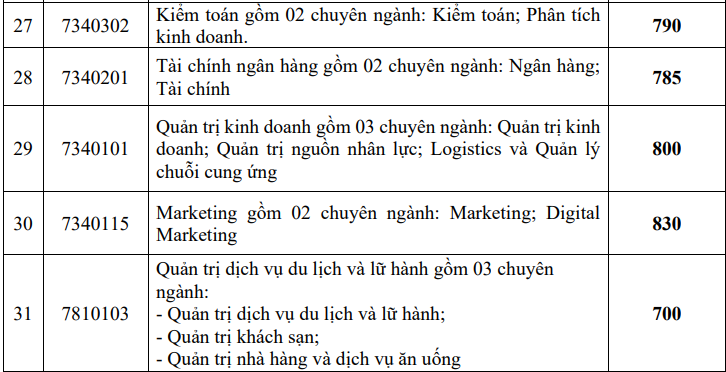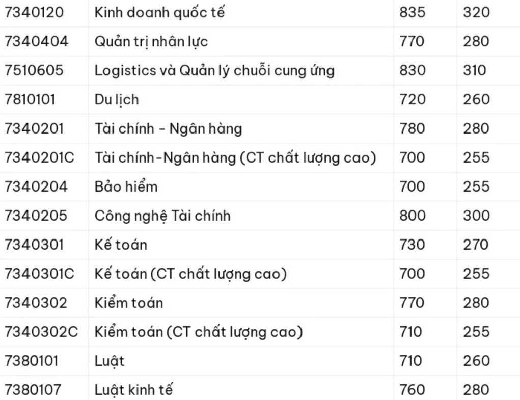 Ở phương thức xét tuyển sử dụng kết quả học tập THPT, điểm trúng tuyển tăng khoảng từ 1 đến 1,5 điểm so với năm ngoái. Trong đó, ngành có mức điểm chuẩn cao nhất là Marketing với 28,50. Với phương thức tuyển thẳng và ưu tiên xét tuyển thẳng theo đề án của trường, trên 90% hồ sơ có điểm trung bình 3 môn của tổ hợp xét tuyển trên 8,5; khoảng 50% hồ sơ có IELTS từ 5.5 trở lên.