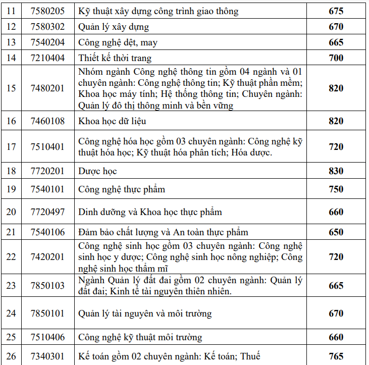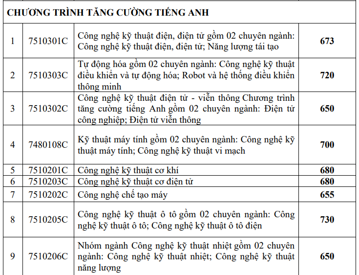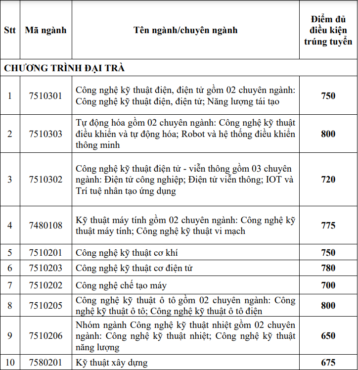 Đáng chú ý, mức điểm chuẩn các ngành ở phương thức này tăng trung bình khoảng 10 điểm. Đặc biệt, Công nghệ kỹ thuật điện tử - viễn thông là ngành có điểm chuẩn tăng cao nhất, tăng 60 điểm so với năm 2023, từ 660 lên 720 điểm.