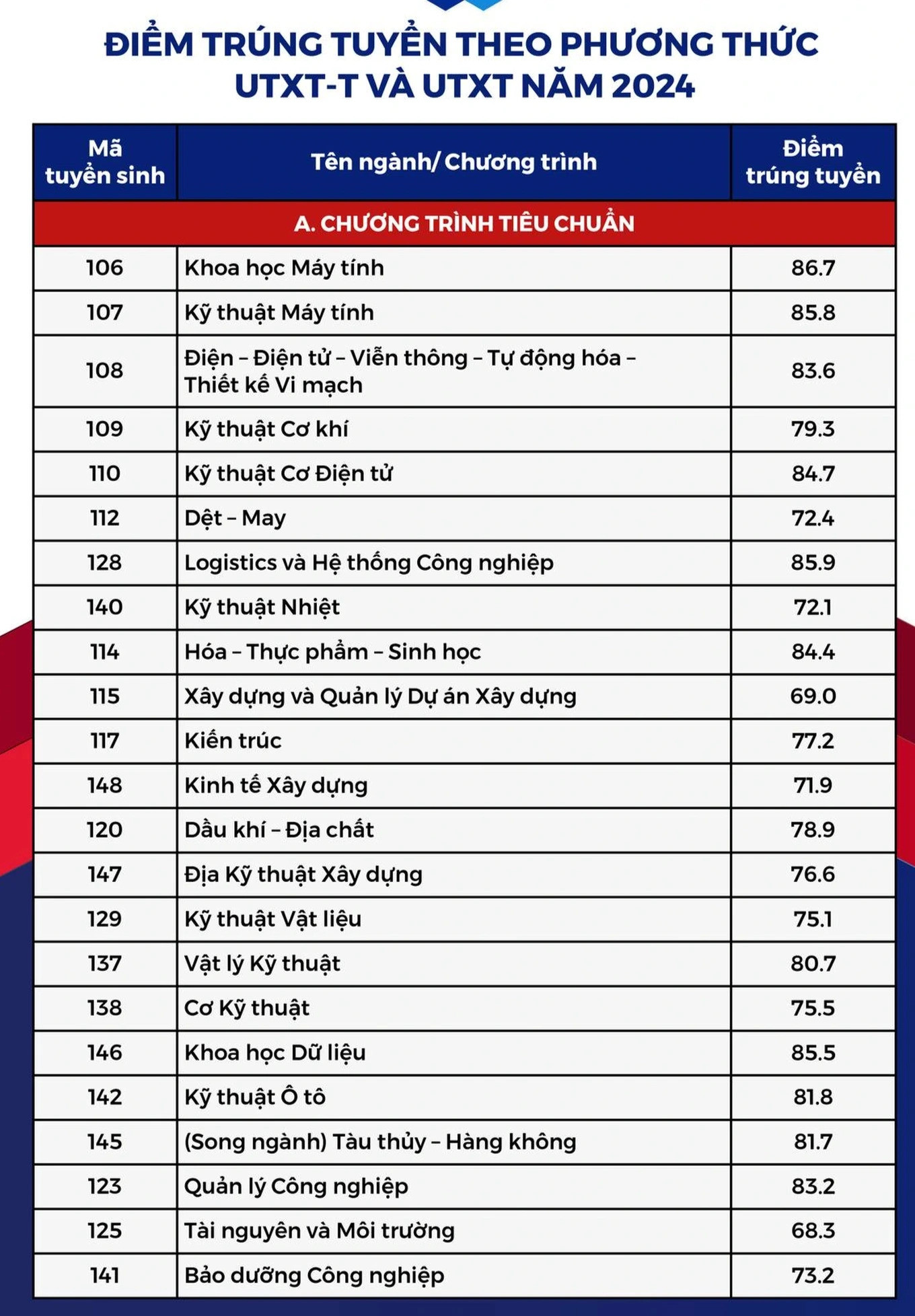 Trường Đại học Bách khoa (ĐHQG TP.HCM) công bố điểm chuẩn các phương thức gồm xét tuyển thẳng theo quy định của Bộ GD&ĐT năm 2024 (phương thức 1.1), ưu tiên xét tuyển thẳng thí sinh giỏi, tài năng theo quy định của Đại học Quốc gia TP.HCM năm 2024 (phương thức 1.2) và ưu tiên xét tuyển theo quy định của Đại học Quốc gia TP.HCM năm 2024 (phương thức 2). Các thí sinh không trúng tuyển theo các phương thức xét tuyển sớm vẫn có thể tiếp tục đăng ký vào các ngành yêu thích với phương thức 5 "Xét tuyển tổng hợp".