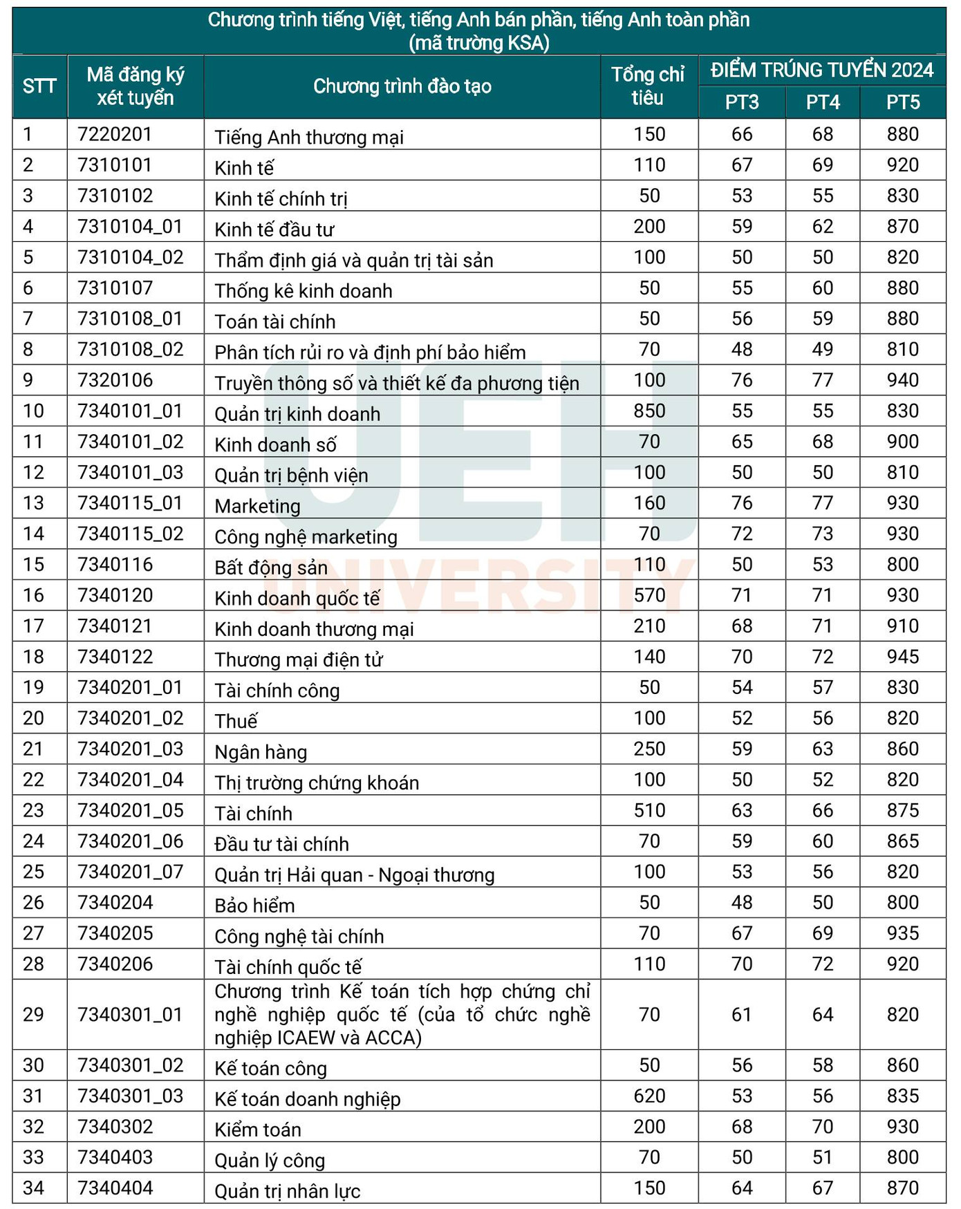 Năm 2024, UEH vẫn giữ nguyên số lượng các phương thức xét tuyển, gồm Xét tuyển HSG, xét tuyển quá trình học tập theo tổ hợp môn xét tuyển, dựa trên điểm thi đánh giá năng lực của ĐHQG TP.HCM.