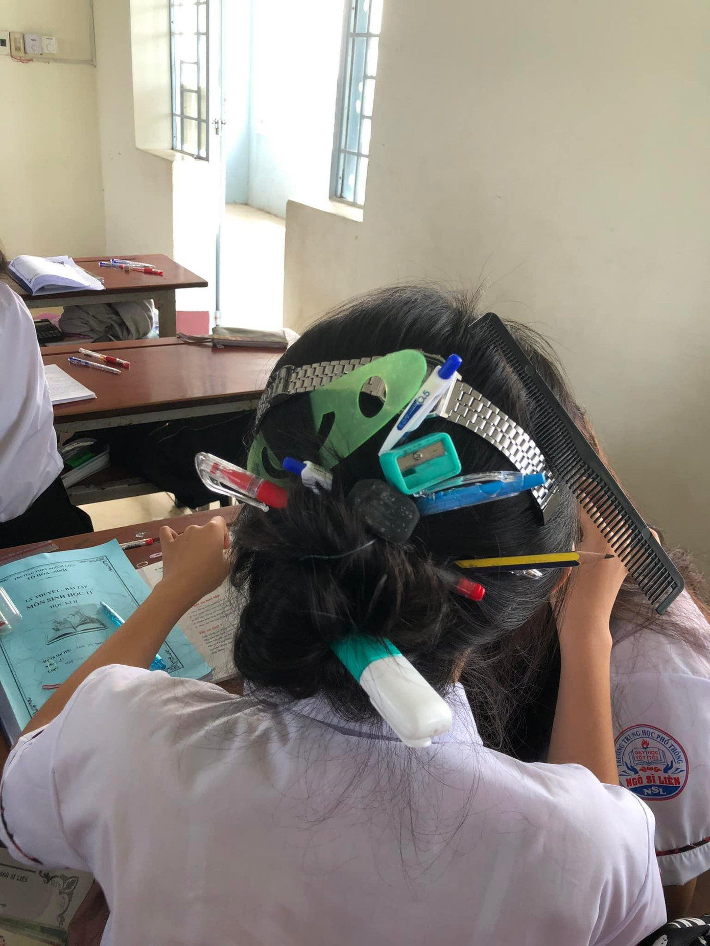 Để tránh tình trạng thất lạc dụng cụ học tập, một "cô bạn lắm chiêu" đã nghĩ ra cách "đánh dấu chủ quyền" đồ dùng học tập theo cách cực sáng tạo thế này đây. Cụ thể, nữ sinh đã tận dụng bộ tóc của mình làm "cây cài đồ". Đầu tiên cô bạn búi tóc rồi dùng một cây bút để cài lên. Sau đó là lần lượt các đồ dùng học tập khác đều được cài lên đầu từ bút bi đến bút chì, cục tẩy, bút xóa, gọt bút chì. Thậm chí cả lược và đồng hồ cũng được cô bạn cài lên đầu. Thế này thì ai đang có ý định "nhăm nhe" mượn bút chắc phải từ bỏ ý định rồi.