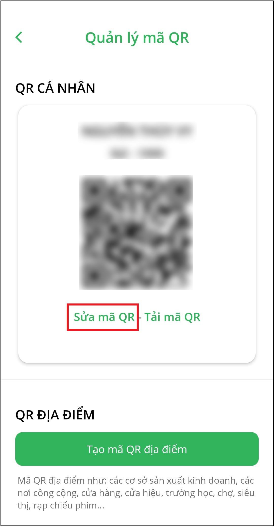 Bước 2: Màn hình sẽ hiển thị mã QR cá nhân của bạn. Phía dưới mã sẽ có 2 mục Sửa mã QR - Tải mã QR > Bạn chọn mục Sửa mã QR để sửa thông tin của mình.