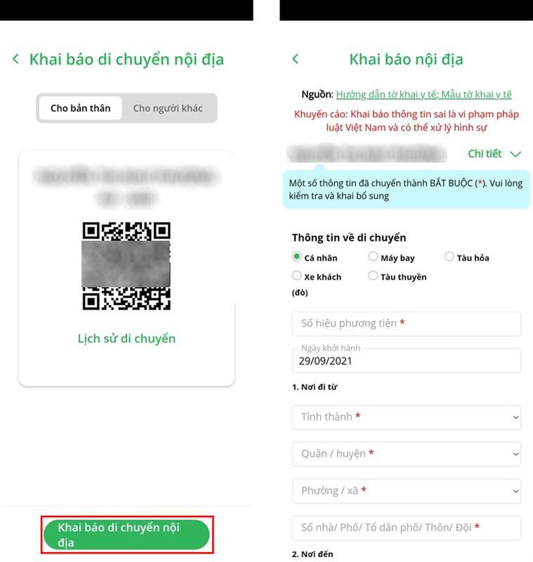 Bước 2: Bạn chọn khai báo cho bản thân hoặc cho người khác, nhấn Khai báo di chuyển nội địa để bắt đầu. Tiến hành điền đầy đủ thông tin vào tờ Khai báo nội địa.