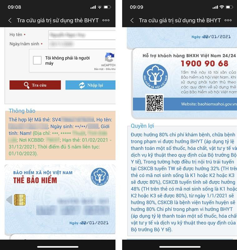 Bước 4: Bạn sẽ nhận được kết quả thông tin đầy đủ về thẻ Bảo hiểm Y tế, mặt trước, mặt sau và quyền lợi được hưởng.