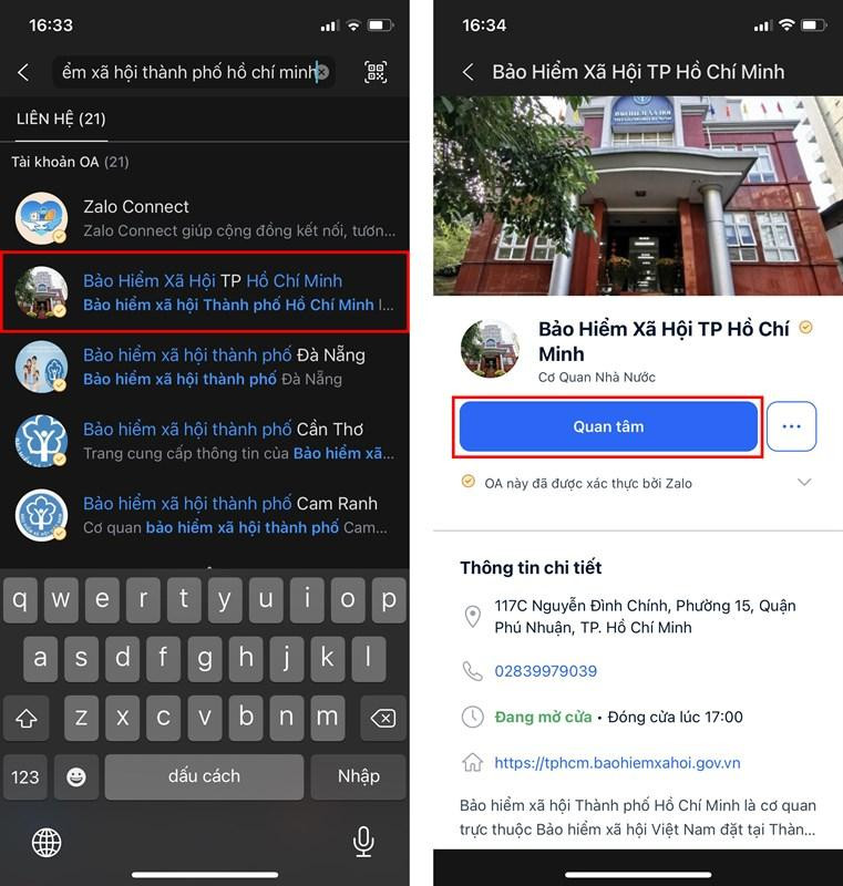 Bước 2: Mở Zalo, bạn chọn khung Tìm kiếm và nhập Bảo Hiểm Xã Hội TP Hồ Chí Minh, nhấn Quan tâm.