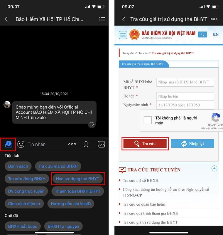 Bước 3: Tại trang Zalo Official Account của Bảo hiểm xã hội TP Hồ Chí Minh, bạn chọn hộp Tiện ích > Hạn sử dụng thẻ Bảo hiểm Y tế > nhập thông tin Mã số Bảo hiểm xã hội/ thẻ Bảo hiểm Y tế, Họ tên và Ngày/Tháng/Năm sinh > nhấn Tra cứu. Các tỉnh thành khác, bạn cũng có thể tra cứu tại đây nhé.