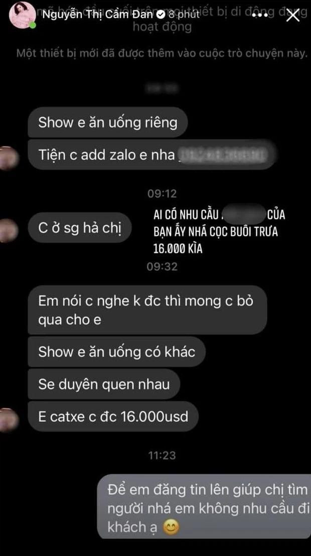 Mới đây, cô đăng tải ảnh chụp màn hình tin nhắn của một người lạ mặt. Người này hứa hẹn sẽ trả 16.000 đôla (khoảng 400 triệu đồng) nếu Cẩm Đan đồng ý đi ăn cùng họ. Ngay sau đó, cô đã trả lời dứt khoát rằng không có nhu cầu đi khách và còn nhấn mạnh “để em đăng tin giúp chị tìm người”.