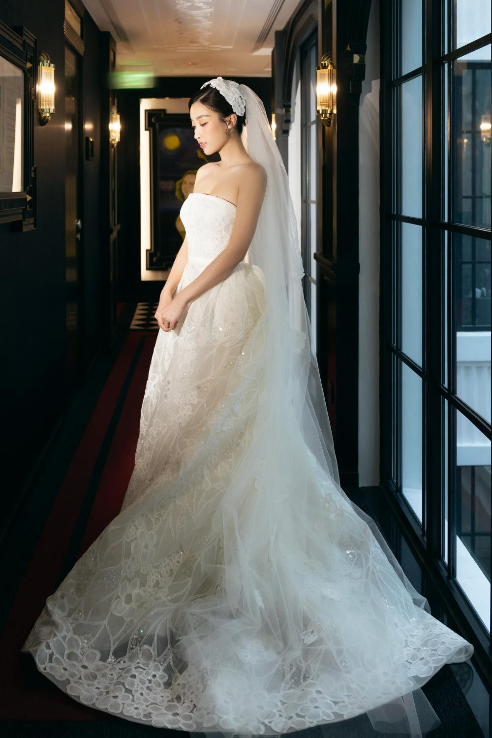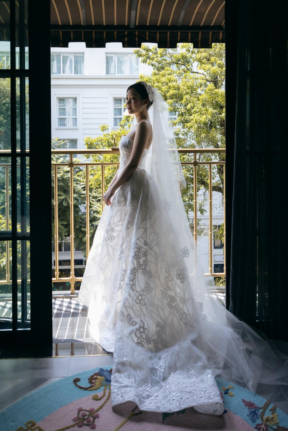 Tới thời điểm làm lễ và tiệc tối, người đẹp chọn váy cưới ren, có phần tùng xoè hơn, kết hợp cùng voan đội đầu xinh đẹp, thanh thoát.