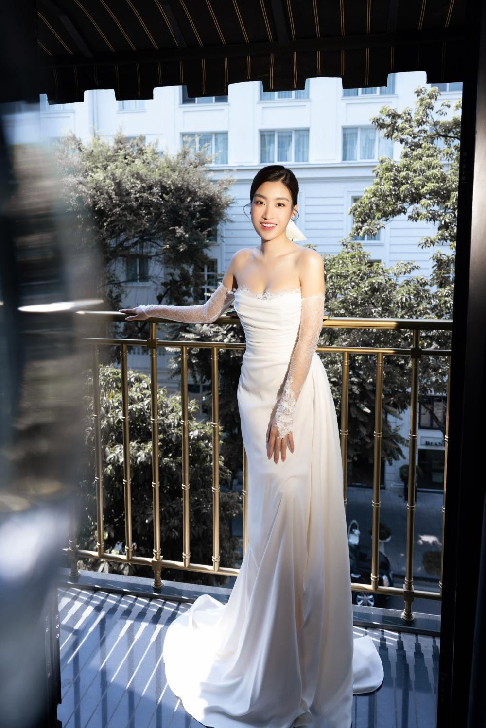 Trong lễ rước dâu buổi chiều 23/10, Hoa hậu Đỗ Mỹ Linh mặc áo dài, sau đó nàng hậu thay váy cưới trắng trơn ôm sát để đón khách.