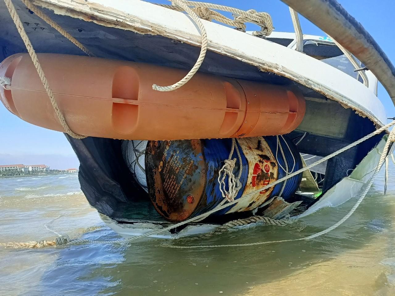 | Ca nô số hiệu QNa-1152 được kéo vào khu vực bãi cạn cách bờ biển Cửa Đại khoảng 150m. |