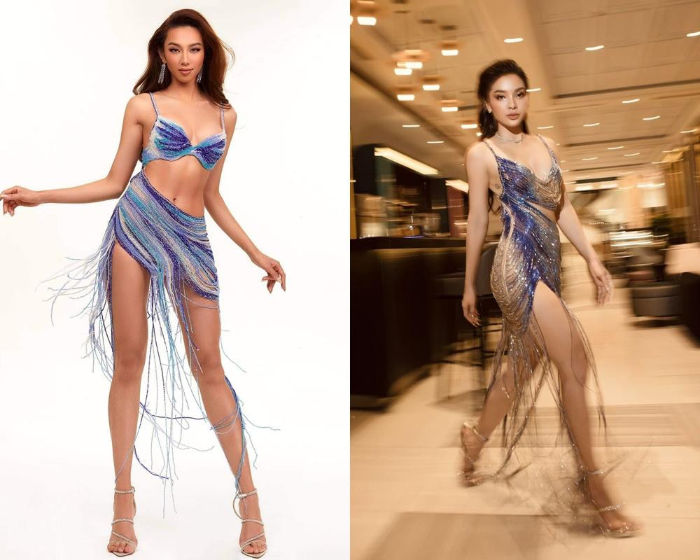 Trong tủ đồ mà Thùy Tiên mang tới cuộc thi Hoa hậu Hòa bình Quốc tế có rất nhiều bộ váy áo cực kỳ gợi cảm. Chẳng hạn như chiếc váy được đính kết từ những sợi tua rua màu xanh lấp lánh vô cùng bắt mắt, giúp người mặc khoe được hình thể chuẩn mực của mình.