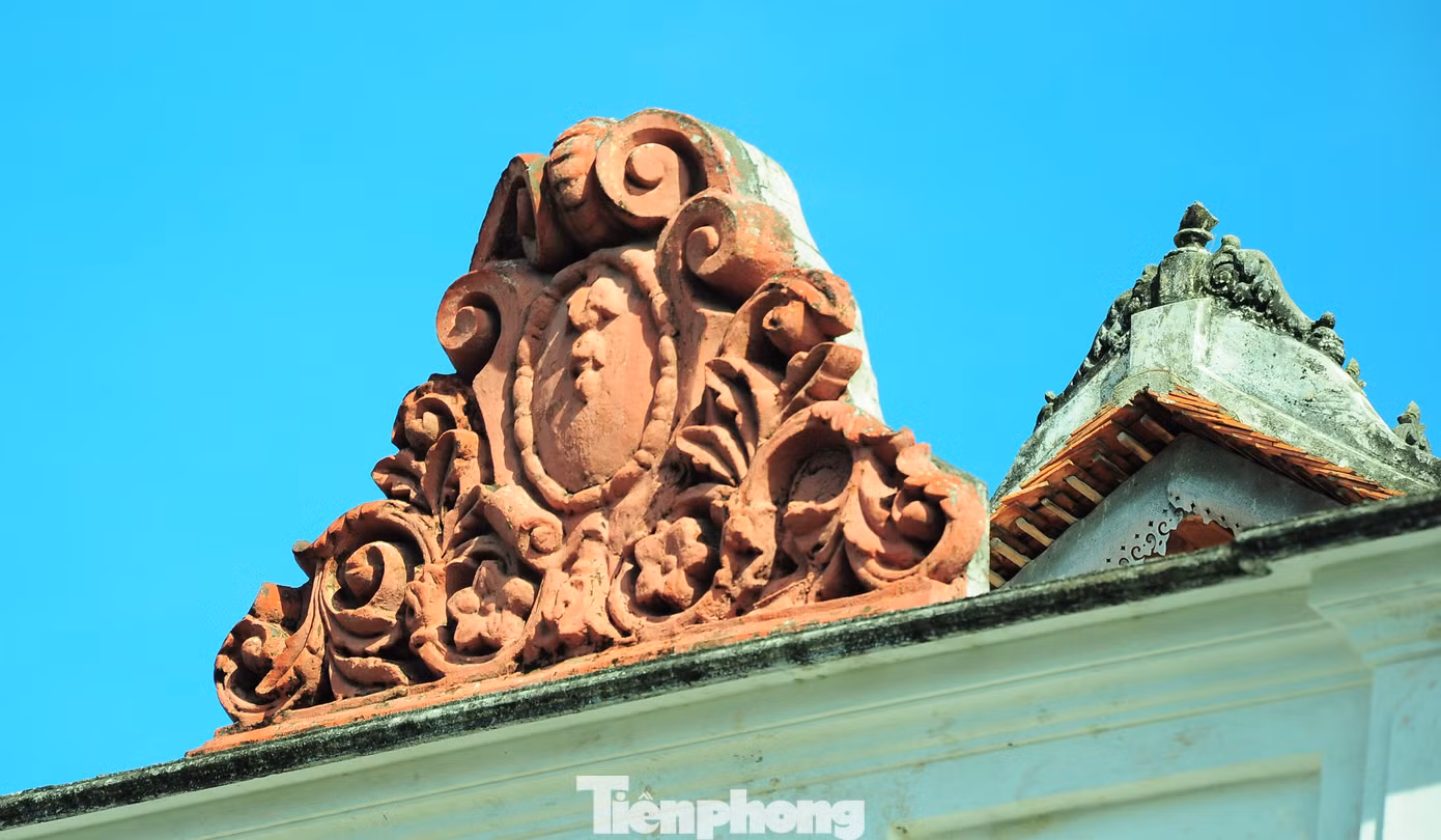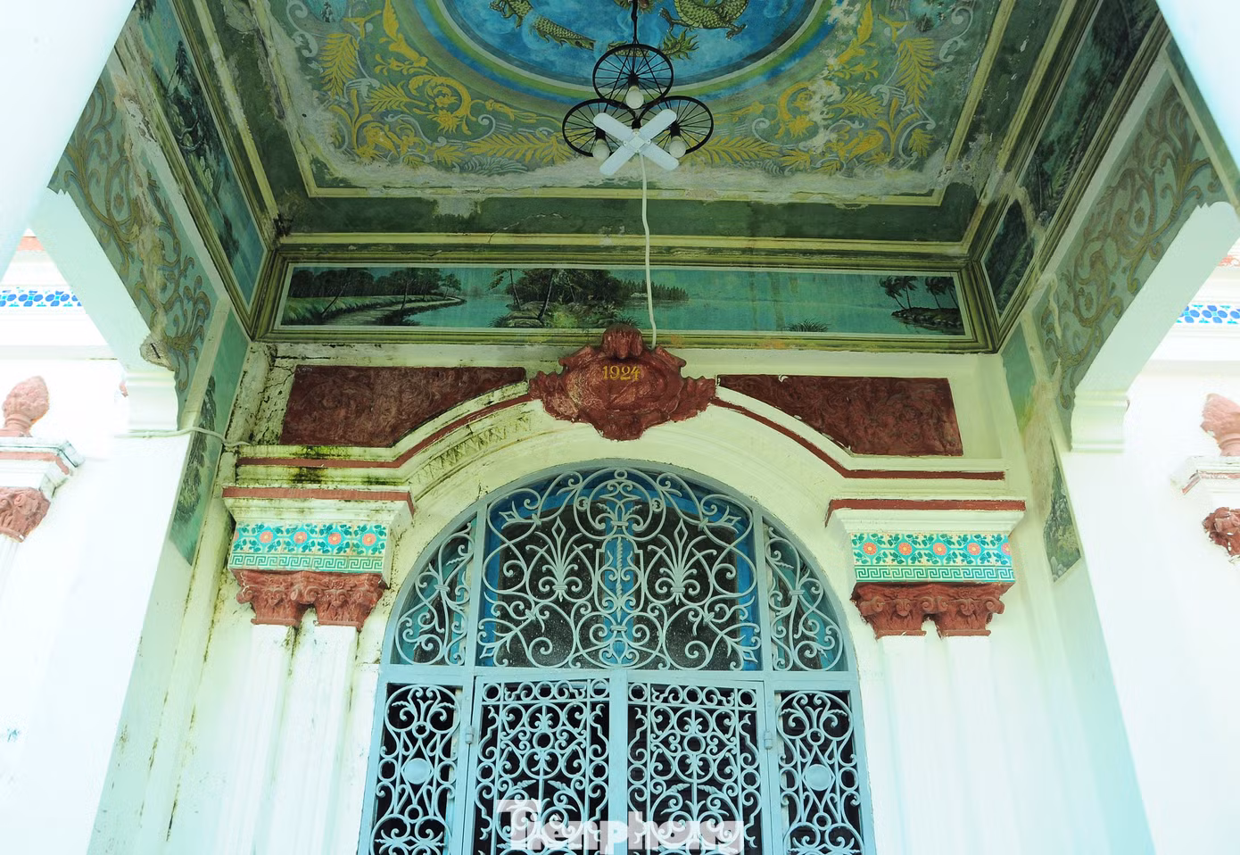 | Sảnh đón nằm giữa nhà và nhô ra phía trước. Trên các cột đều gắn phù điêu; trần, vách có tranh vẽ về đề tài ngư - tiều - canh - độc, núi sông, nhà cửa, ghe thuyền... |