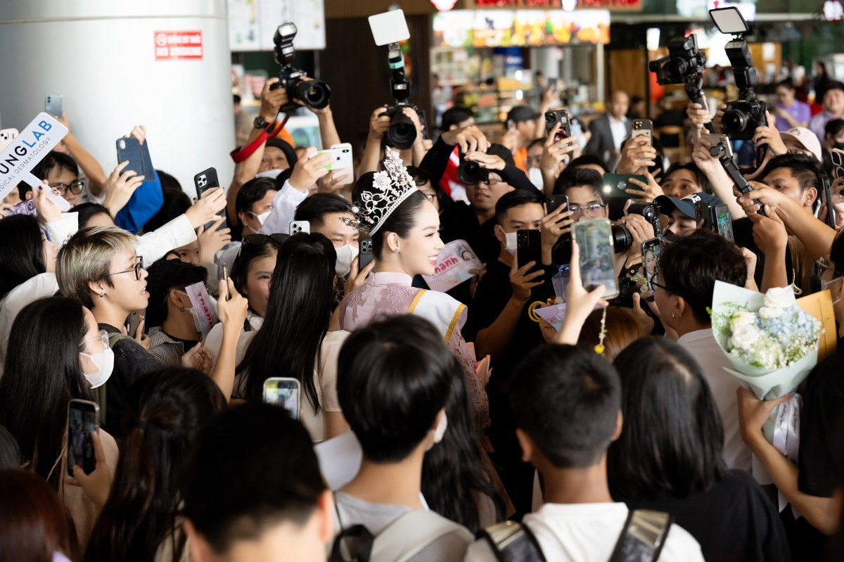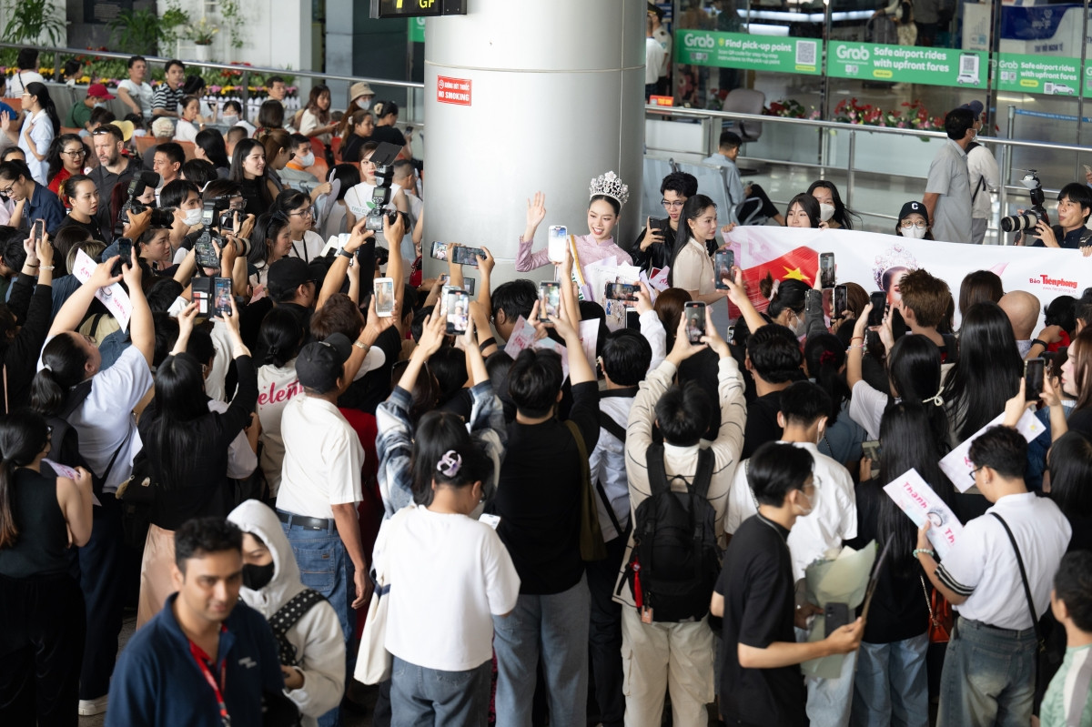 Đông đảo người hâm mộ đã chờ đón Hoa hậu Thanh Thủy tại sân bay quốc tế Tân Sơn Nhất vào 9 giờ sáng. Diện trang phục áo dài truyền thống, đội vương miện Miss International 2024, người đẹp nhận được sự chào đón nồng nhiệt từ hàng trăm người hâm mộ, gia đình và bạn bè.