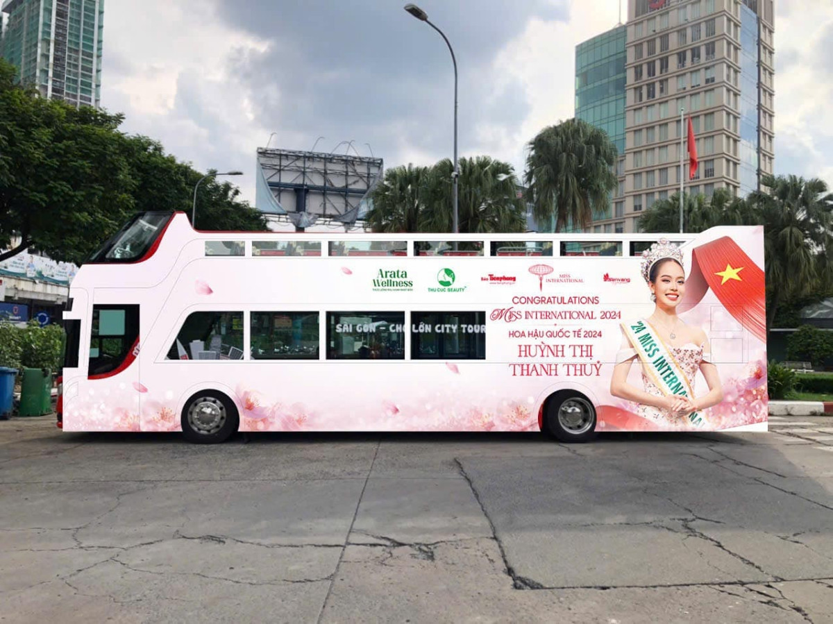 Rời sân bay, Hoa hậu Thanh Thủy lên xe buýt hai tầng được chuẩn bị đặc biệt, đi qua các tuyến đường trung tâm TP.HCM. Chuyến diễu hành đi qua nhiều địa điểm và cung đường quan trọng của thành phố.