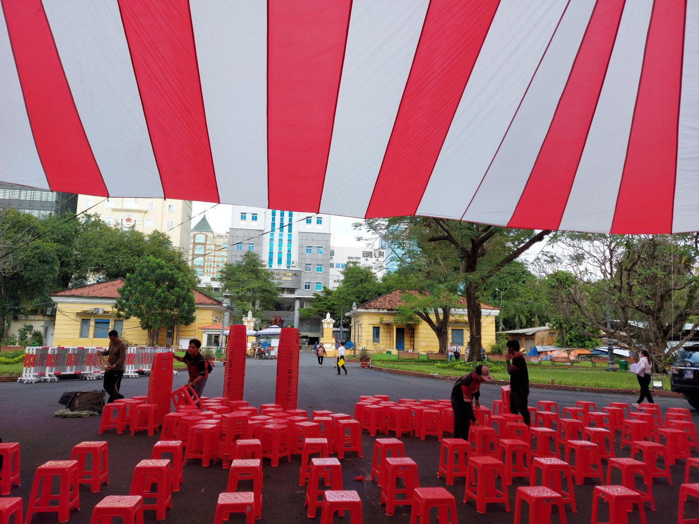 Để chuẩn bị cho phiên tòa, TAND TPHCM đã dựng rạp rộng 600 m2, bố trí màn hình LED trước sân tòa để người dân theo dõi quá trình xét xử. Ngoài ra, tòa cũng bố trí màn hình ti vi cạnh phòng xét xử để mọi người theo dõi.
