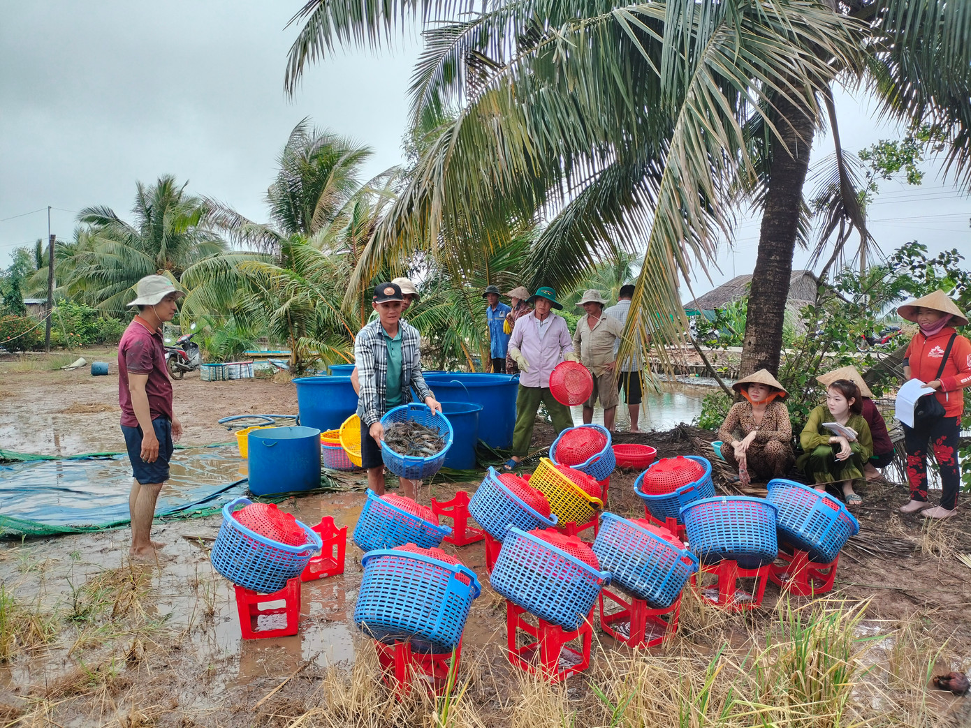 Gia đình ông Hiếu có khoảng 1,5ha diện tích thả tôm càng xanh xen canh vụ lúa. Sau hơn 5 tháng thả nuôi, gia đình thu hoạch tôm mang lại thu nhập thêm hơn 50 triệu đồng, ngoài tiền từ bán lúa.