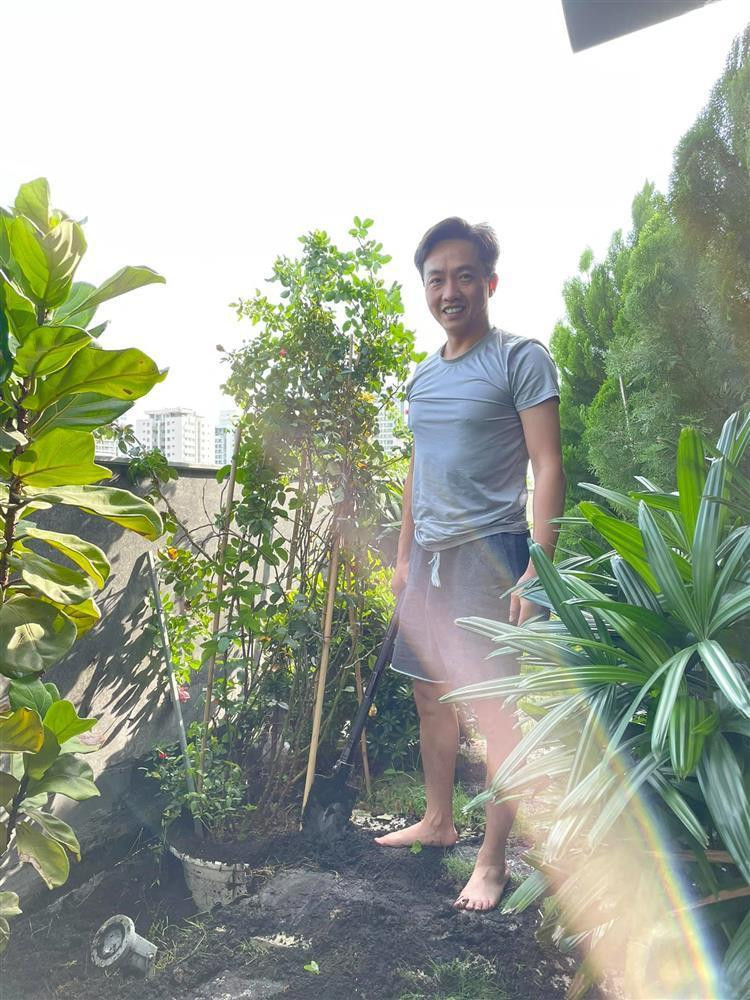 | Ông xã Đàm Thu Trang vui vẻ khi tự tay trồng và sắp xếp lại cây cối ở sân thượng. |